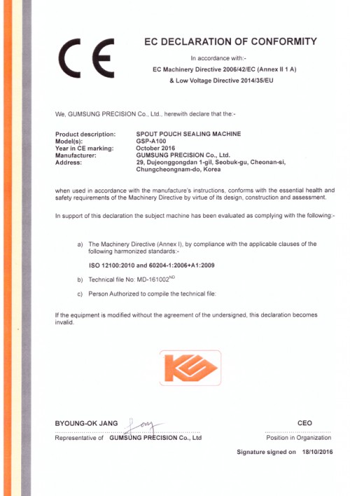 SPOUT POUCH SEALING MACHINE CE인증서 페이지 정보 작성자 금성정밀(주) 댓글 0건 조회 1,028회 작성일 18-11-02 15:18 본문 SPOUT POUCH SEALING MACHINE CE인증서 목록 이전글SPOT POUCH LEAK TESTER CE인증서 18.11.02 다음글SPOUT POUCH SEALING MACHINE(2-Lane) CE인증서 18.11.02