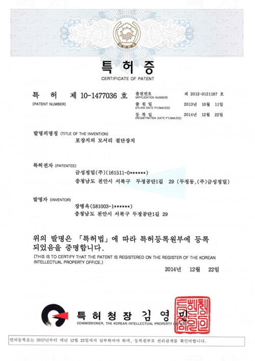 포장지의 모서리 절단장치 특허 제10-1468162호 페이지 정보 작성자 금성정밀(주) 댓글 0건 조회 470회 작성일 18-11-02 15:16 본문 포장지의 모서리 절단장치 특허 제10-1468162호 목록 이전글파우치형 액체저장 용기의 스파우트 실링장치 특허 제10-1485151호 18.11.02
